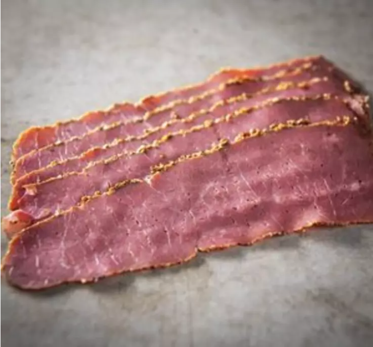 Deze pastrami is dun gesneden, klaar om te genieten op een vers broodje of als opvallend element op een aperitiefplank. De kruidige korst geeft het geheel een pittige kick die perfect in balans blijft met het sappige vlees.